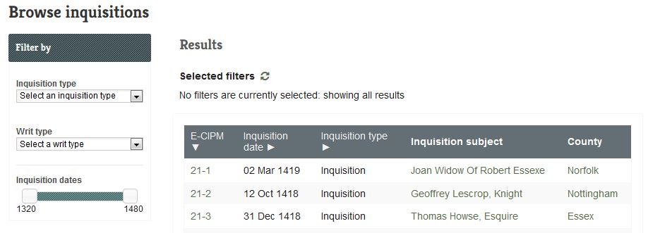 This page provides an ordered list of IPMs in this edition. It can be filtered by date using the slide bar. (Be aware this filter will not include any undated inquisitions). It can also be filtered by inquisition type and writ type. Search results can be ordered according to inquisition number, date and type.