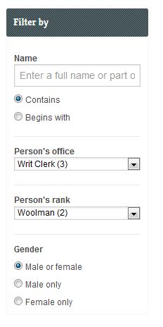 - by name, using the name box to the left. The * wildcard is supported. (Examples: contains "emma", starts with "ta*l*r"). Note that searching for multiple words is not permitted (so you may search for "lincoln" but not "bishop of lincoln"). The image above shows results filtering by [contains "emma"]