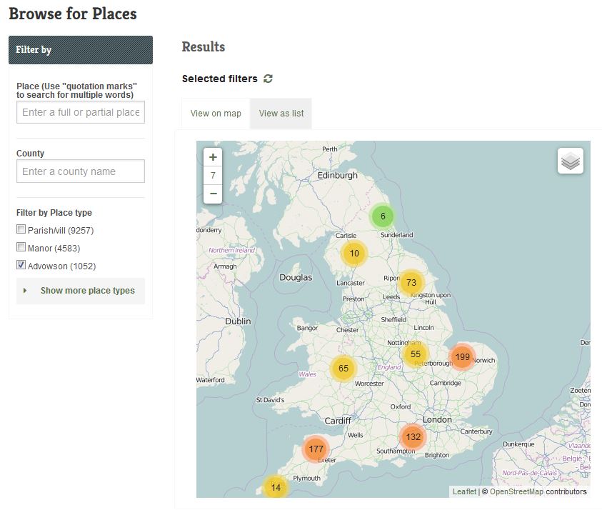 Results may be refined using the same filters. For example you could search for: advowsons in Hampshire, or parish/vill names containing the string "valence"