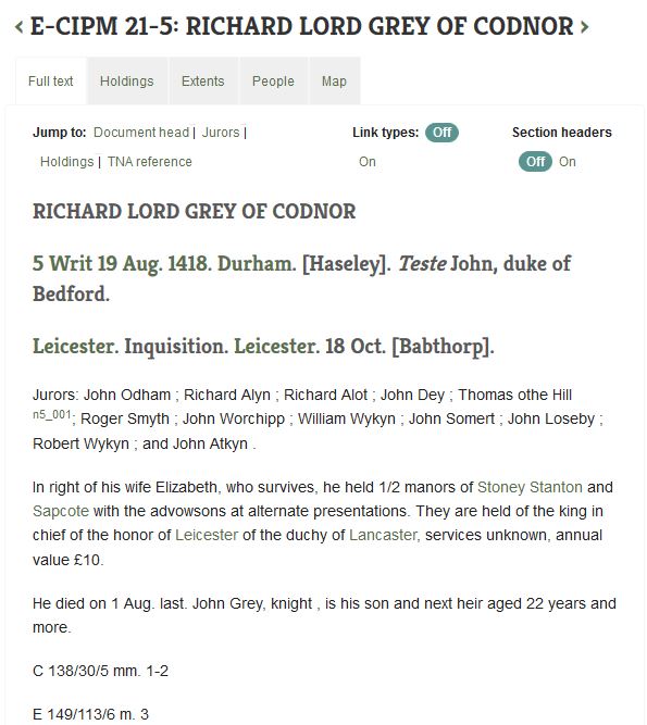 The default view provides the full text of inquisition selected. Panels at the top of the page allow you to view summary information relating to holdings and extents (where this information is available), a list of people occuring in the document, and a map of places mentioned.