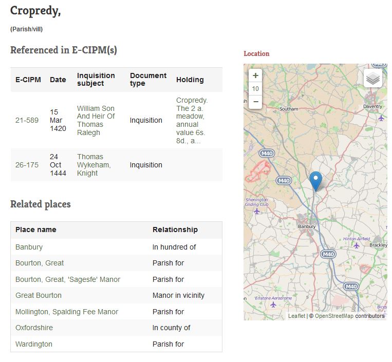 This provides a summary of the contexts in which a given place occurs, with details of date, inquisition subject and county. Where available, a summary of any holdings information is also provided.