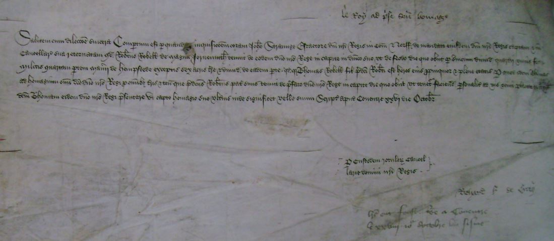 PSO 1-69-1 - Robert Robell - detailPSO 1/69/1, certificate of homage for Thomas son of Robert Robell (detail), with the signature of Richard lord Grey (d. 1418), chamberlain. Image reproduced courtesy of the National Archives.