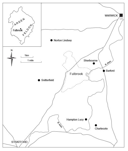 Fulbrook lies between Stratford and Warwick on the western side of the river Avon, which defines part of the parish boundary (see map 1). The Avon which bisects Warwickshire from south-west to north-east has traditionally been seen as the frontier between the Feldon (to the east) where nucleated villages cultivated extensive open fields planted with corn, and the Arden where settlements were scattered, arable fields were sometimes enclosed, and more land was used as pasture and wood. This division of the county into contrasting landscapes was first described by John Leland writing in the 1540s, but the words Arden and Feldon were being used in place names centuries before 1500. In fact the frontier was not defined exactly by the river, as Hampton Lucy (in Bedford's day known as Bishop's Hampton) which adjoins Fulbrook to the south, was in many ways typical of a Feldon village, and a number of other similar settlements lay on that side of the Avon. [3. C. Dyer, ‘Rural settlement in medieval Warwickshire', Transactions of the Birmingham and Warwickshire Archaeological Society, 100 (1996), 117-32.] Did Fulbrook's landscape belong in Arden or Feldon? The 1436 extent points to a transformation from one type of landscape to another.