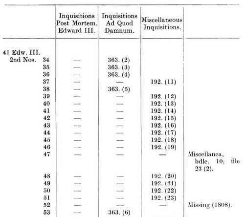 Further losses occurred between the compilation of the c.1600 inventory and the publication of the Calendarium, in which various IPMs were noted as missing (although a number were later re-discovered).[11. Such as the Shropshire inquisitions for Thomas Fouleshurst, CIPM xviii.351-2; cf. Calendarium, 2 Henry IV no. 11; likewise John Charleton (3 Hen. IV no. 53) and Richard Radmele (3 Hen. IV no. 57; CIPM xviii.370-1).] These losses, again, were not extensive, likewise amounting on a very rough average to no more than one or two per regnal year. Again, many of the missing IPMs can be reconstructed at least in part from the Calendarium, other inventories, the escheators' accounts and later writs.