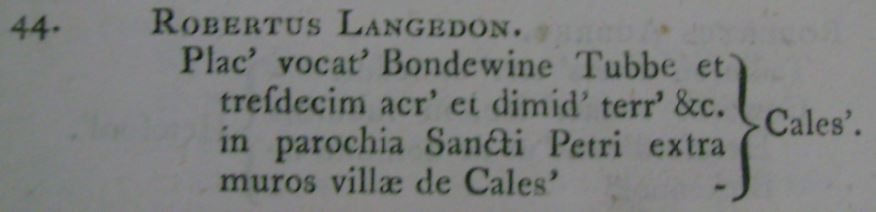 To return to Robert Langdon, these various sources make it clear CIPM xix.252 was mistaken to suggest that the lost inquisition of 2 Henry V should be identified with that of 13 Henry IV. The writ on the fine roll cited by CIPM refers to two distinct inquisitions, one taken by Henry Orwell mayor (this is CIPM xix.286) and another taken by Henry Meriffeld (evidently the lost inquisition). The early inventories also refer to two separate inquisitions of 13 Henry IV and 2 Henry V.[12. Dated 1 Henry V in the Rawlinson inventory.] Unfortunately the escheators' accounts for Calais do not survive at TNA either as originals or enrollments, but it seems reasonably clear that the inquisition of 2 Henry V specified the tenures that had been omitted from the earlier inquisition.